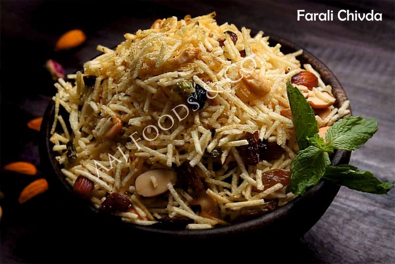 Farali Chiwda is a light and crunchy snack made from fried potatoes, peanuts, and mild fasting-friendly spices. Its delicious taste and crispy texture make it perfect for tea-time snacking and festive or fasting occasions.