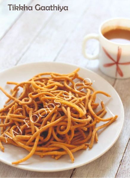 Tikkha Gathiya is a spicy and crispy snack made from gram flour and seasoned with bold traditional Indian spices. Its crunchy texture and fiery taste make it perfect for tea-time snacking and spice lovers.